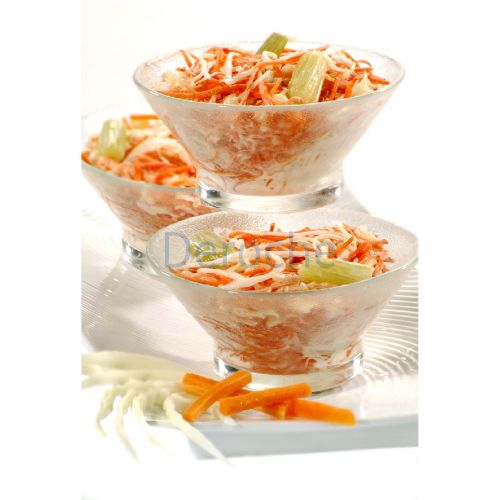 Choux blancs râpés 33,3 %, sauce 33 % [ huile de colza, eau, jaune d'œuf, vinaigre d'alcool, moutarde de Dijon ( eau, graines de moutarde, vinaigre d'alcool, sel ), amidon modifié de pomme de terre, épaississant : gomme xanthane ], carottes râpées 19 %, oignons, sel, sucre, poivre blanc.