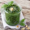 Huile de tournesol, basilic ( 22 % ), huile d'olive vierge extra ( 14 % ), pignons de pin ( 7,9 % ), sel, exhausteur de goût ( glutamate de sodium ), ail ( 4,5 % ), huile de colza totalement hydrogénée, sucre, stabilisant ( chlorure de calcium ), antioxydant ( extrait riche en tocophérols ).