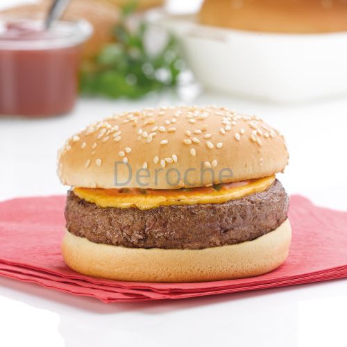 Pain rond garni de viande hachée cuite, de fromage fondu et de sauce.